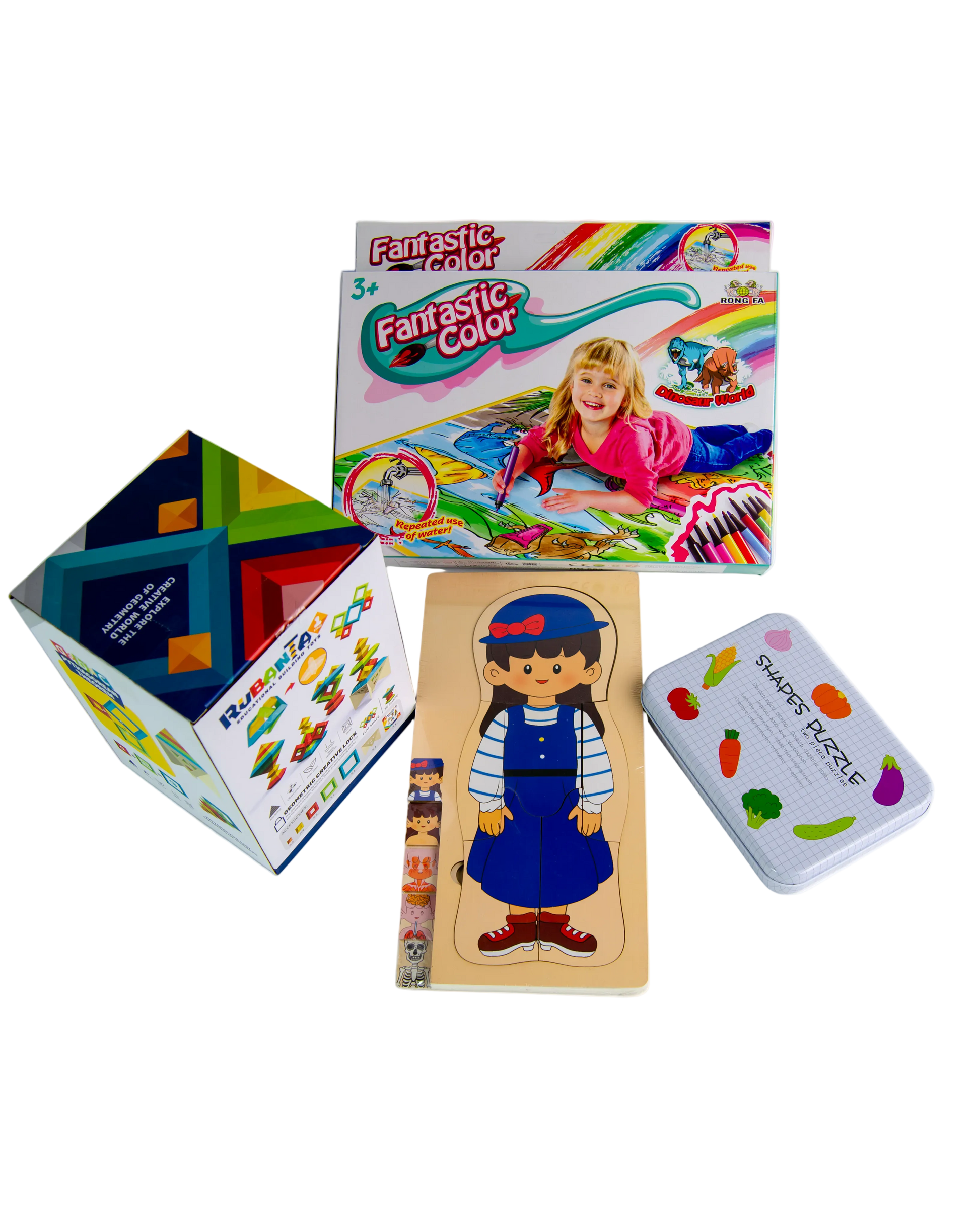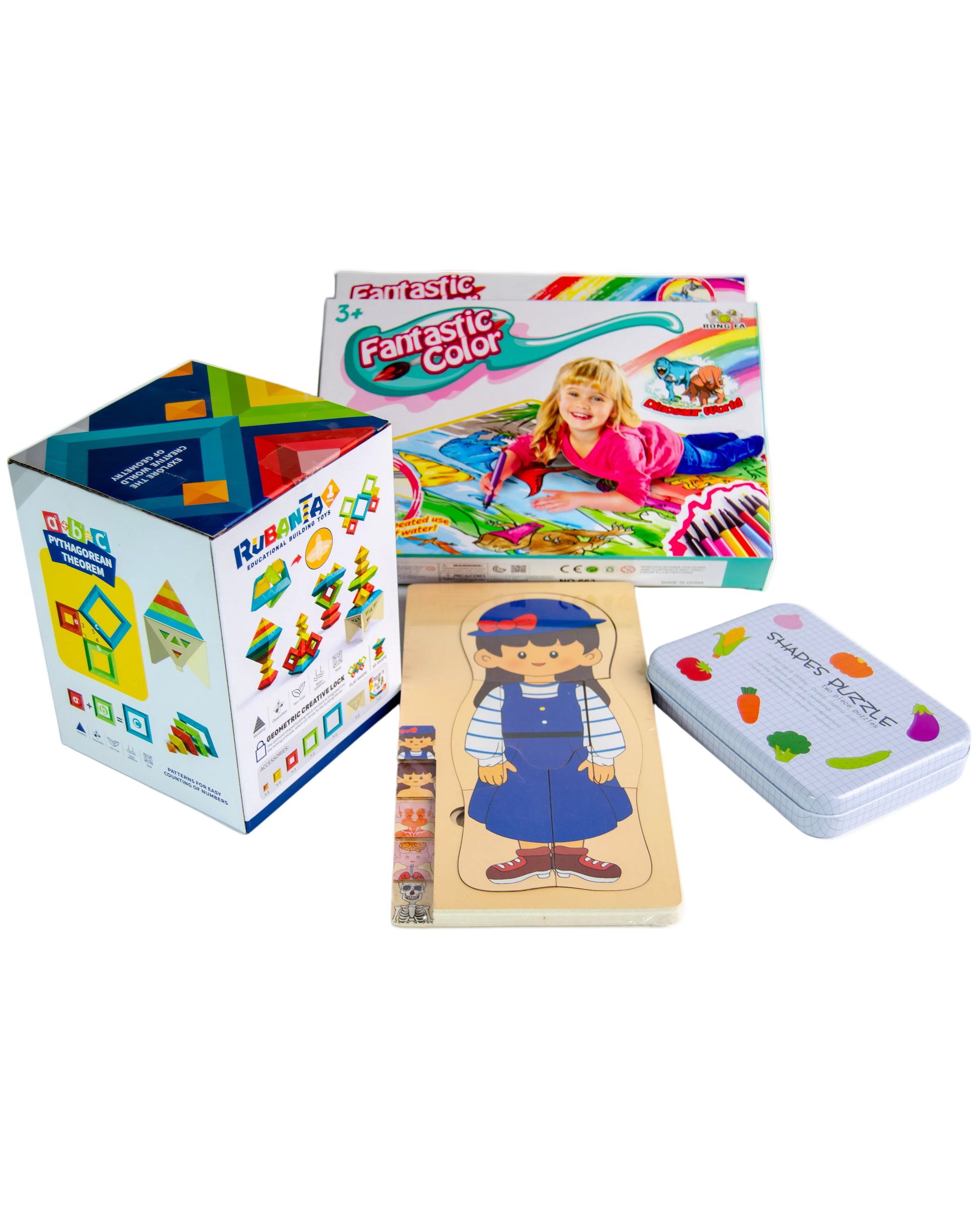 - Includes: 1x Pyramid Blocks Set, 1x Anatomy Puzzle, 1x Coloring Mat, 1x Tin Puzzle.