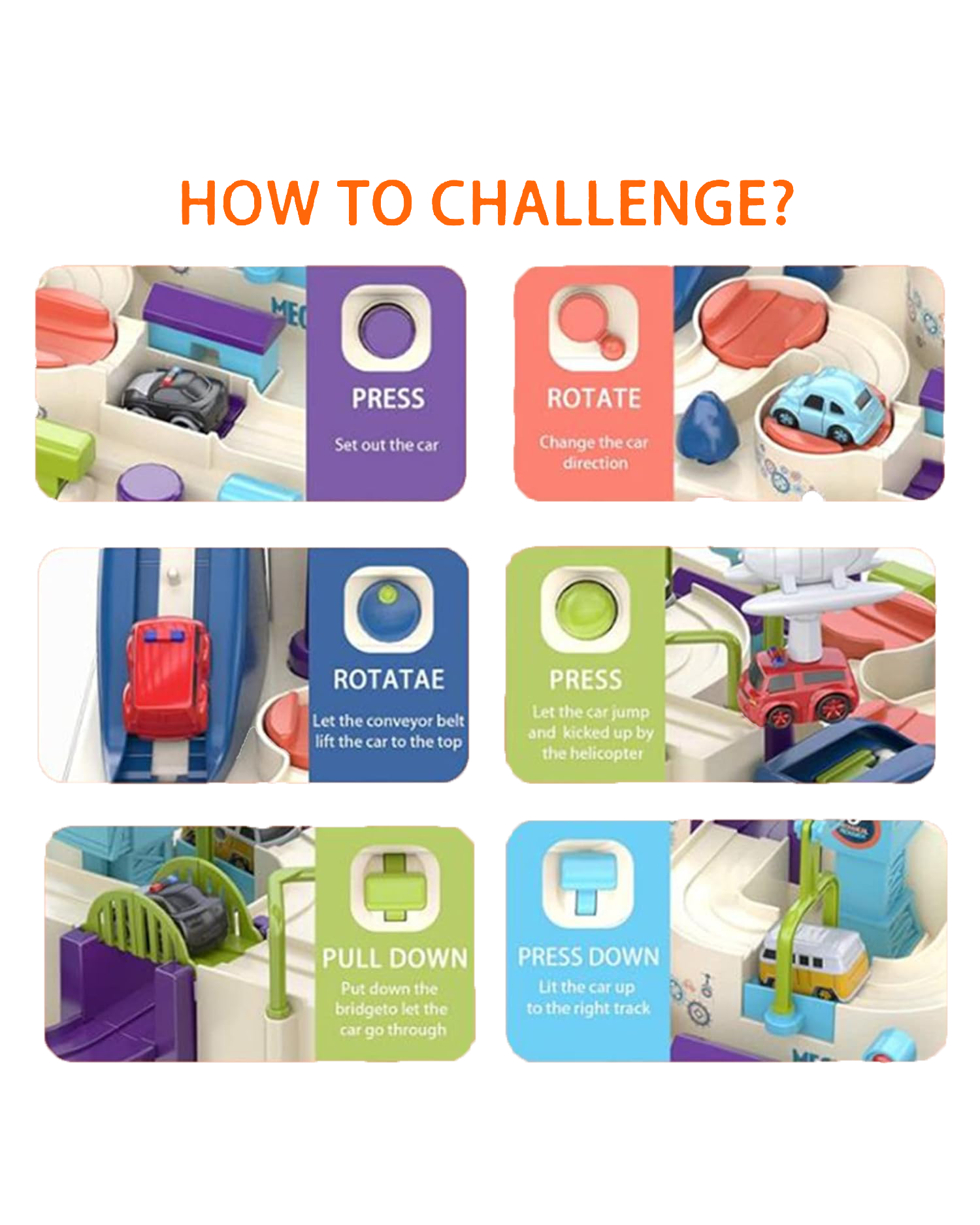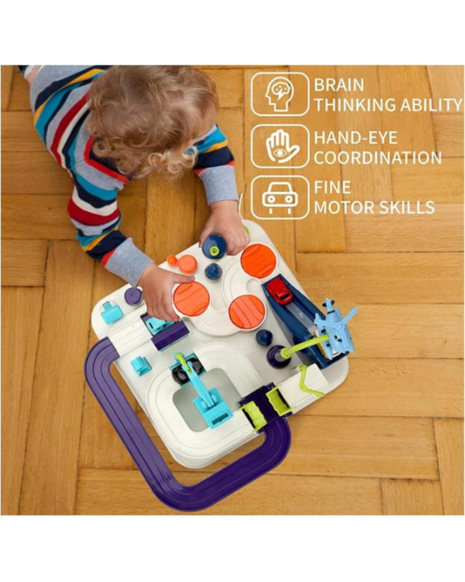 اللعبة دي هتاخده لعالم تاني! دي مش مجرد مسار سيارات، دي "مدينة مغامرات ميكانيكية" بتشتغل بالكامل بدون بطاريات. بيستخدم 6 أزرار مختلفة عشان يتحكم في الكباري، الونش، والطيارة الهليكوبتر ويوصل 5 عربيات لخط النهاية. لعبة بتعلمه "السبب والنتيجة" (Cause & Effect) وتقوي عضلات إيده وتركيزه بعيد عن الشاشات!
