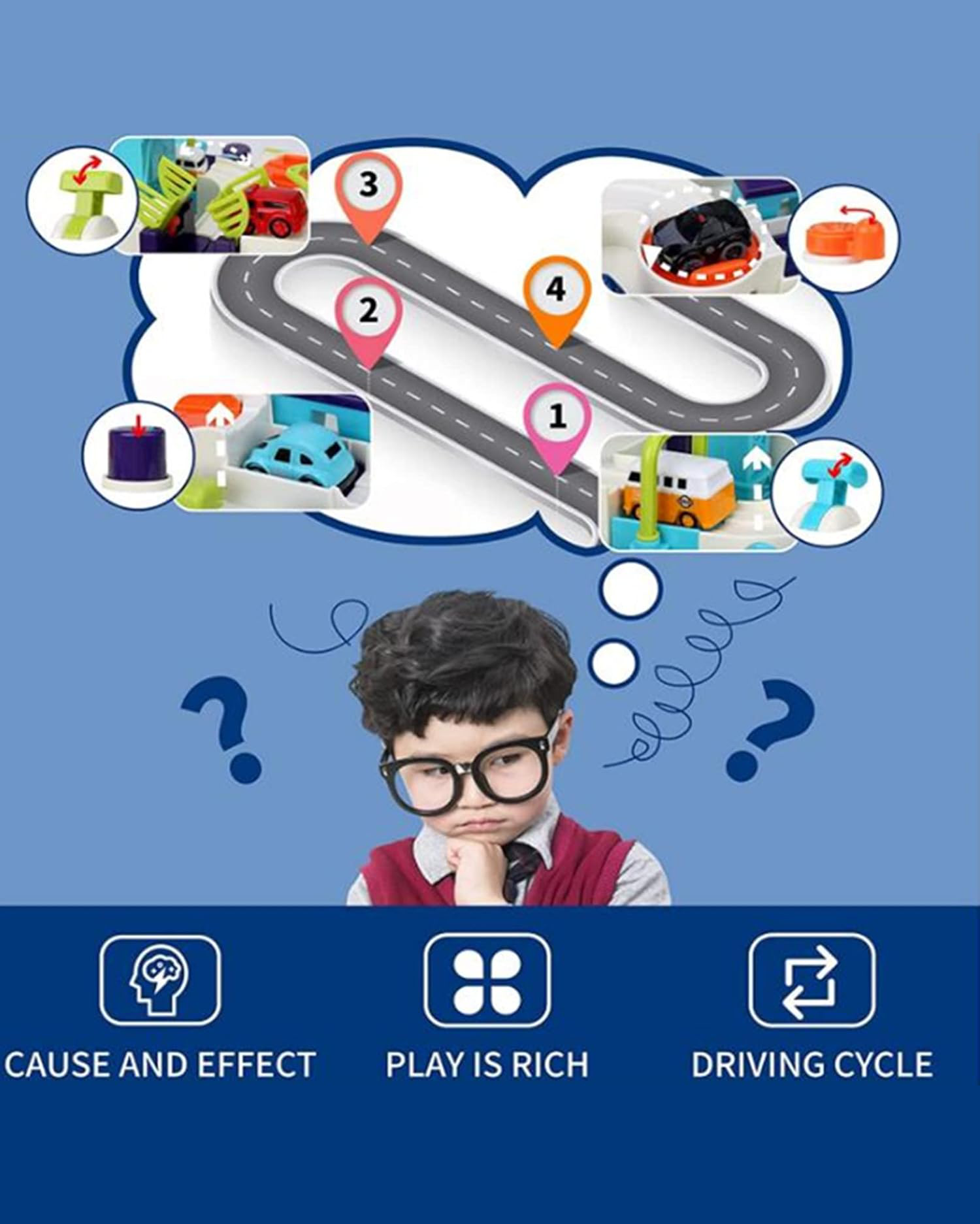 - تعلم السبب والنتيجة (Cause & Effect): الطفل يربط بين حركة يده للزر وبين التغيير الذي يحدث في المسار لتتحرك السيارة.