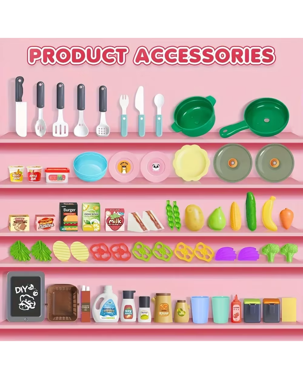 - Variety of pretend play food, vegetables, and fruits.