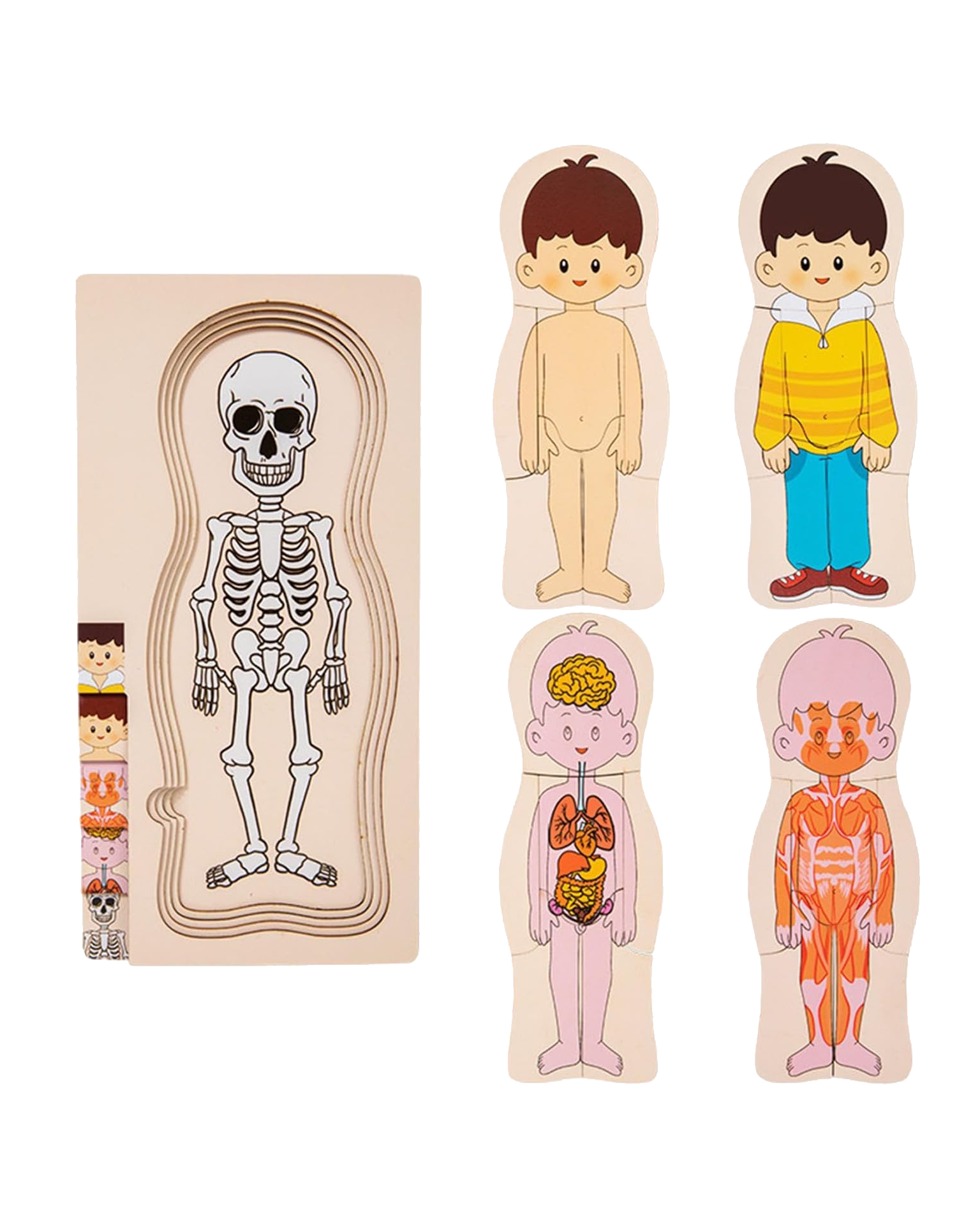 - 2️⃣ بازل طبقات جسم الإنسان (Human Body Layers): درس علوم ملموس! 5 طبقات خشبية بتتشال عشان الطفل يكتشف إيه اللي تحت جلده (الهيكل العظمي، الأعضاء، العضلات). 🦴🧬