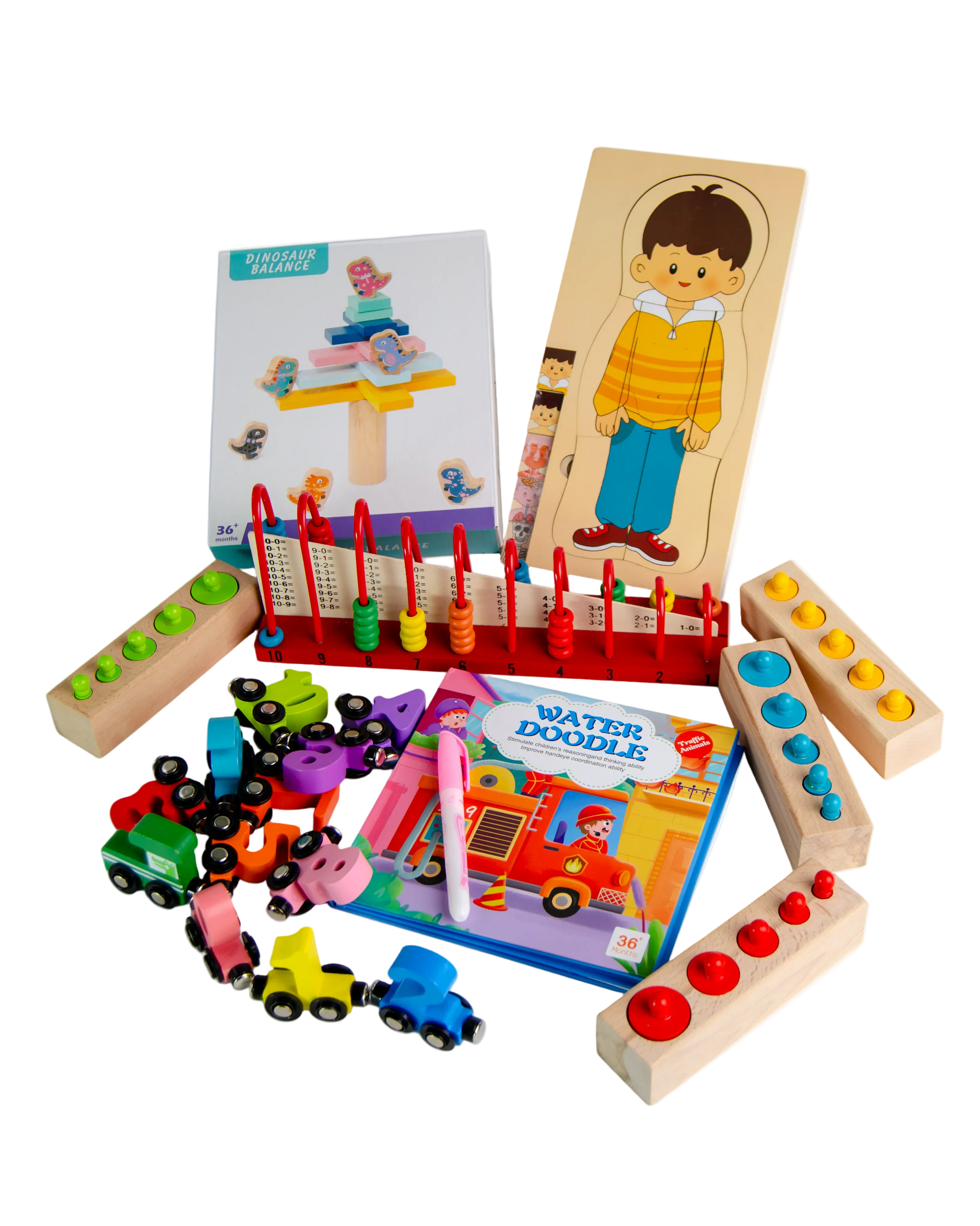 - Included: 1x Dinosaur Balance, 1x Body Puzzle, 1x Cylinder Set, 1x Calculation Shelf, 1x Number Train, 1x Water Book.