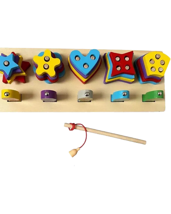 Kids can use the magnetic rod to "catch" the colorful wooden fish, improving their hand-eye coordination and patience. Afterward, they can challenge themselves by sorting the unique stacking blocks—Hearts, Flowers, Stars, and more—onto the correct pegged columns.