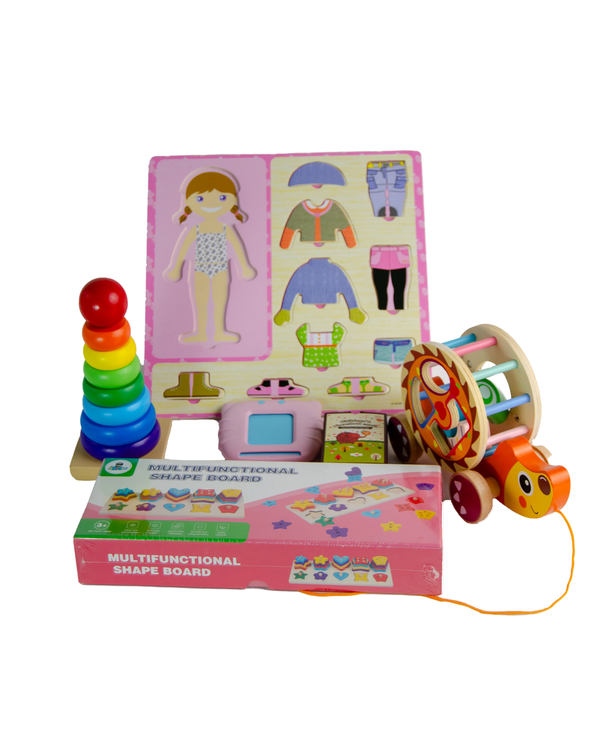- Includes: 1x Pink Card Reader, 1x Dress-up Puzzle, 1x Shape Board, 1x Rainbow Tower, 1x Animal Trailer.
