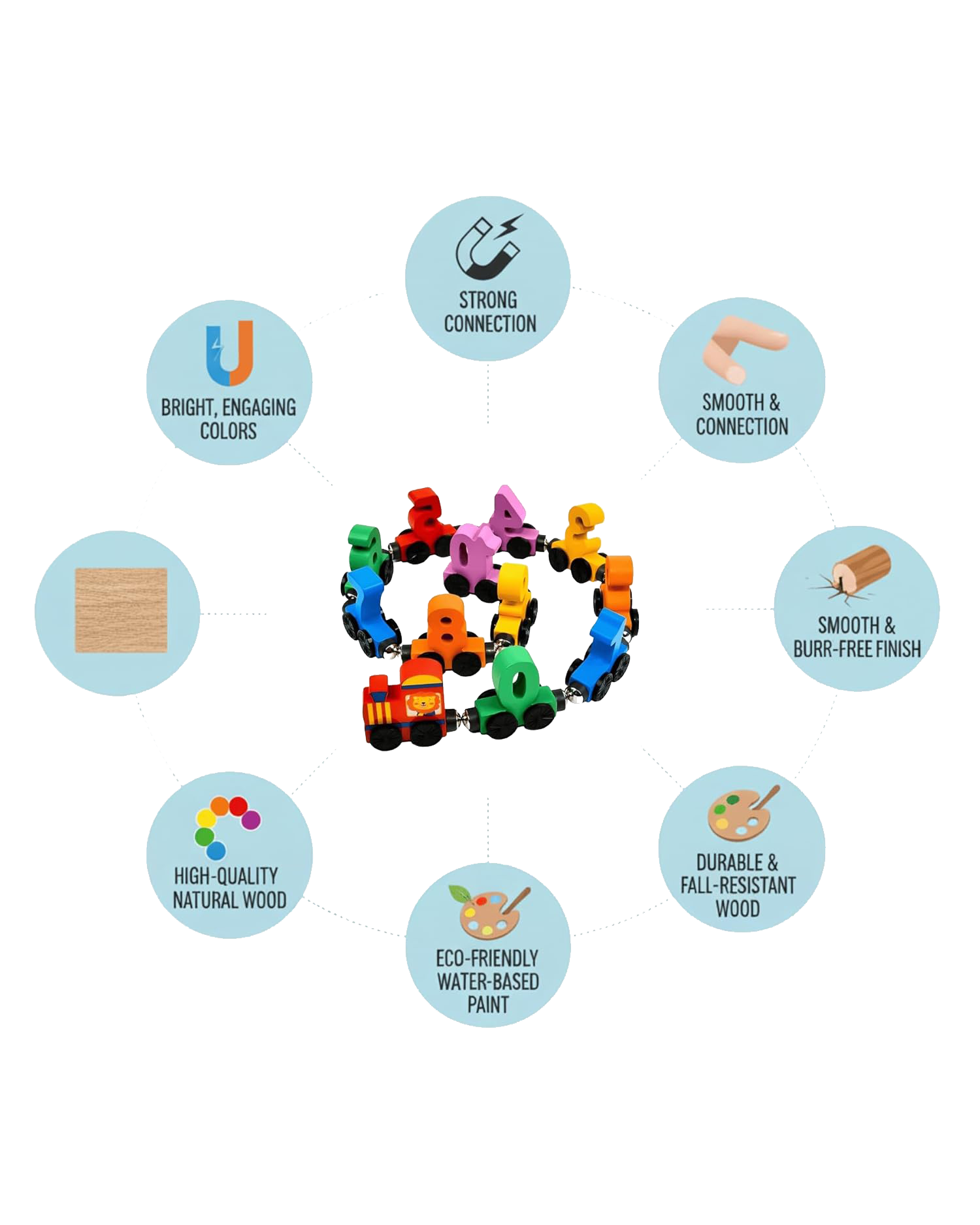 - خشب طبيعي آمن: مصنوع من خشب عالي الجودة بحواف ناعمة جداً (Burr-free) ومدهون بألوان مائية صديقة للبيئة وآمنة تماماً. 🌳🎨